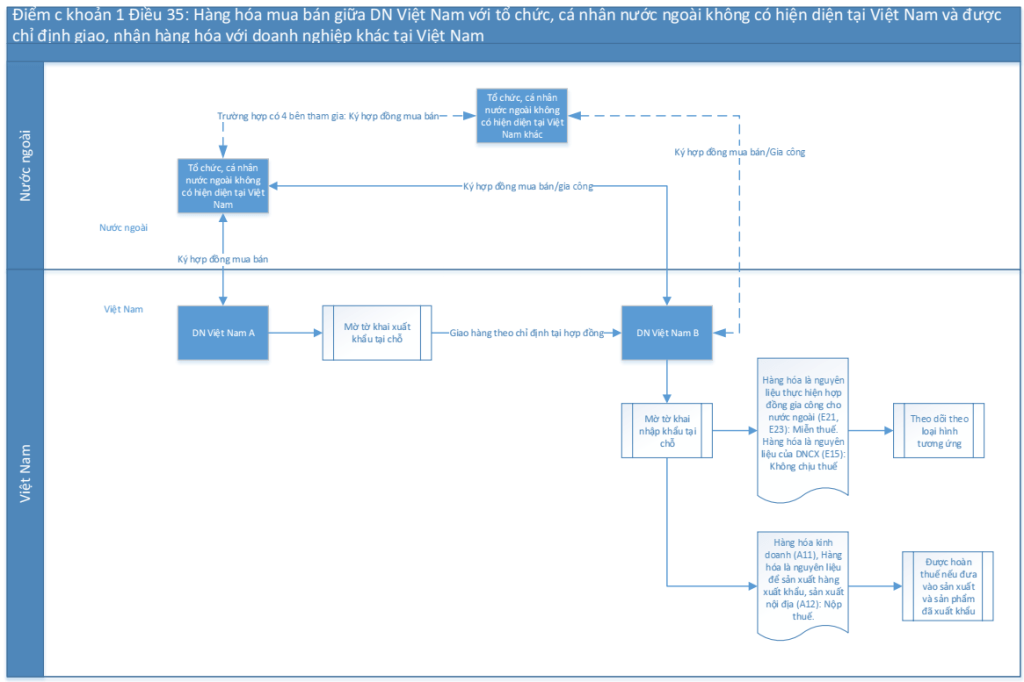 Quy trình TTHQ XNK TẠI CHỖ theo Điểm c khoản 1 Điều 35: Hàng hóa mua bán giữa DN Việt Nam với tổ chức, cá nhân nước ngoài KHÔNG có hiện diện tại Việt Nam và được chỉ định giao, nhận hàng hóa với doanh nghiệp khác tại Việt Nam