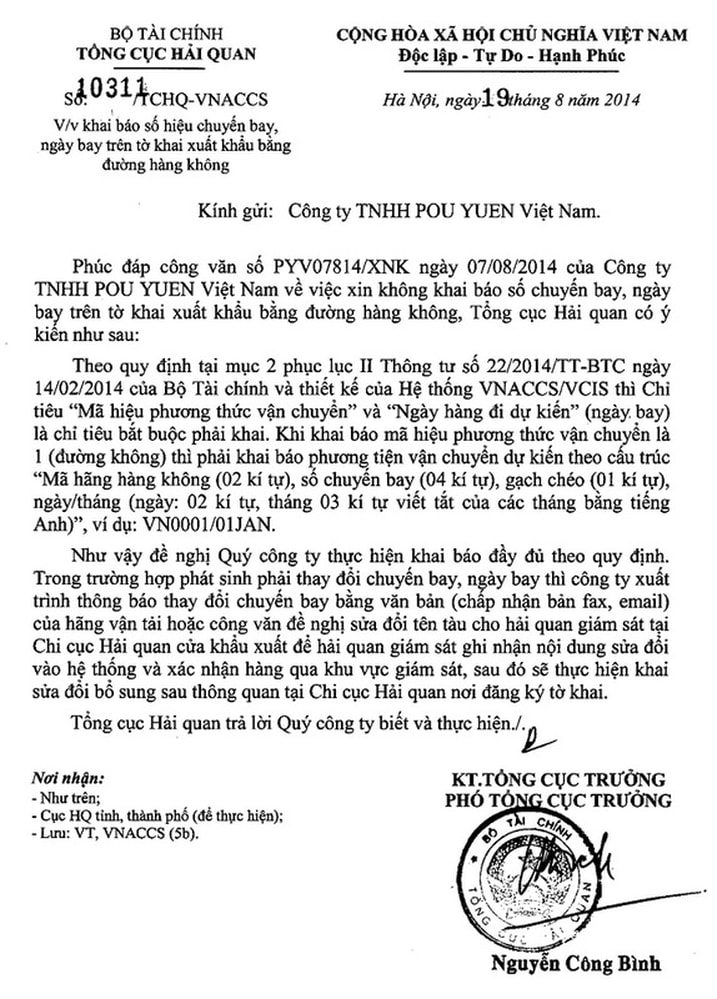 – Đối với các lô hàng làm thủ tục HQ trong giờ hành chính hoặc không có tính chất gấp, doanh nghiệp có văn bản đề nghị sửa đổi thông tin về chuyến bay, hãng bay, ngày giờ bay gửi chi cục hải quan cửa khẩu xuất và chi cục hải quan nơi mở tờ khai, trong đó ghi rõ lý do thay đổi, ký và đóng dấu xác nhận của doanh nghiệp để xuất trình tại khu vực hải quan giám sát tại cửa khẩu xuất. Chi cục hải cửa khẩu xuất căn cứ vào văn bản đề nghị của doanh nghiệp để xác nhận hàng đã qua khu vực giám sát. Chi cục hải quan nơi mở tờ khai cập nhật bổ sung thông tin về chuyến bay, hãng bay… mới bằng nghiệp vụ trong Hệ thống VNACCS/VCIS.