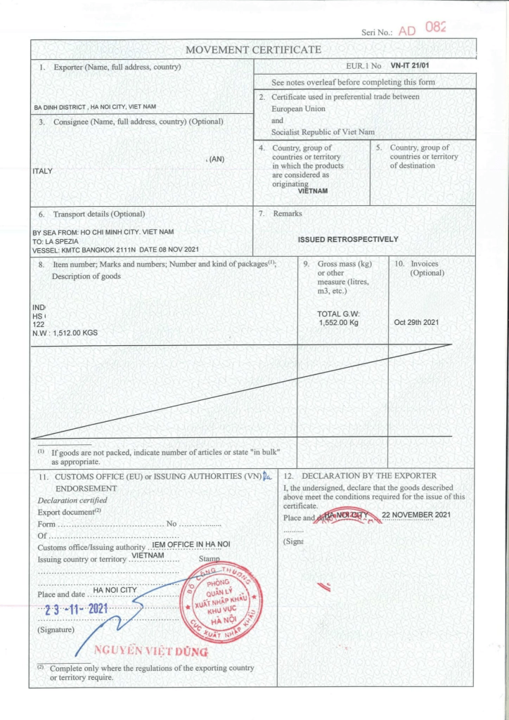 Thời gian có được CO form EUR.1 bản giấy là từ 1-2 ngày làm việc, kể từ khi nhận đầy đủ bộ hồ sơ.
